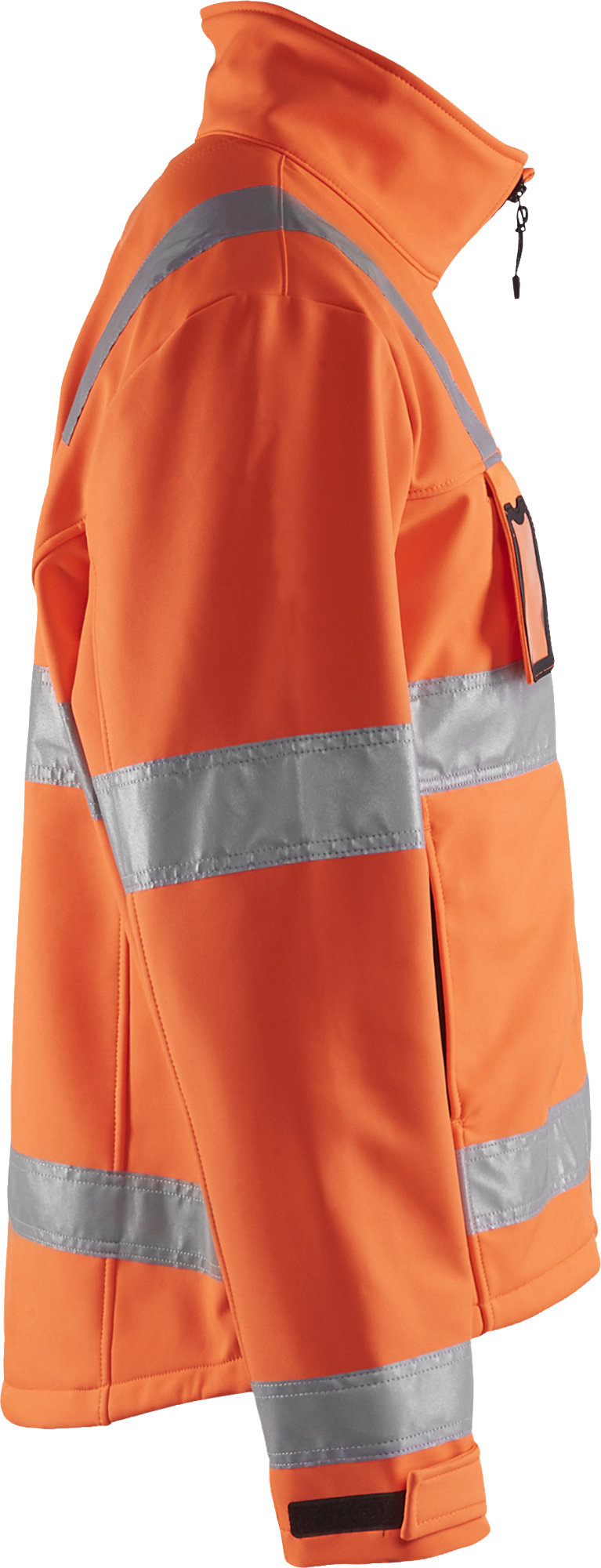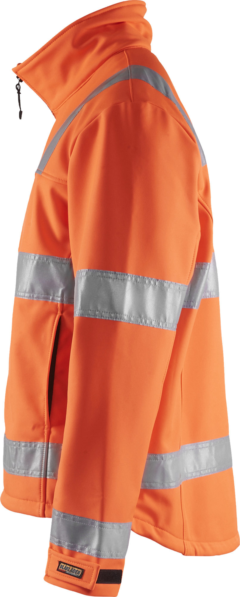 Jas softshell high vis met striping van het merk Blaklader, wind- & waterdicht. Met een aanrijgkoord aan de onderkant van de jas en verstelbare manchetten.